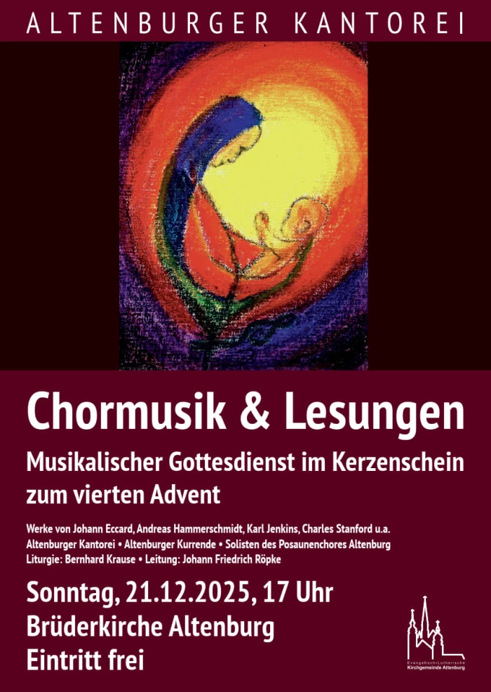 Am vierten Advent wird die Brüderkirche zu einem Ort der Besinnlichkeit. Um den hektischen Weihnachtstagen entgegenzuwirken, lädt die Altenburger Kantorei gemeinsam mit Solisten des Posaunenchores und jungen Sängerinnen der Kurrende zu einem musikalischen Gottesdienst ein.