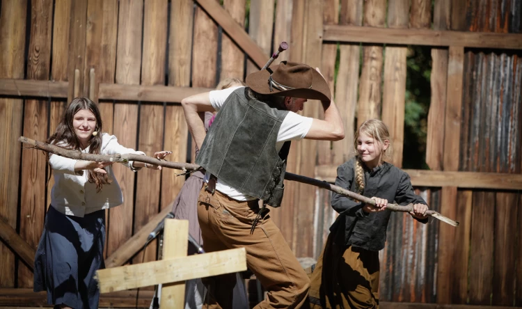 Unter dem Titel „Das Gold von Clayton Hill“ erwartet das Publikum am Samstag, den 16. August und am Sonntag, den 17. August von 10 bis 17 Uhr ein rasantes Bühnenabenteuer unter freiem Himmel inmitten der Westernkulisse im Schnaudertal. Zusammen mit den schießwütigen Outlaws aus Meißen und dem wuchtigen Gitarrensound der Band „Motor Kabowski“, verwandeln sie die Kulisse in ein kurzweiliges Westernspektakel.