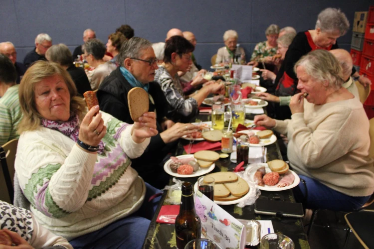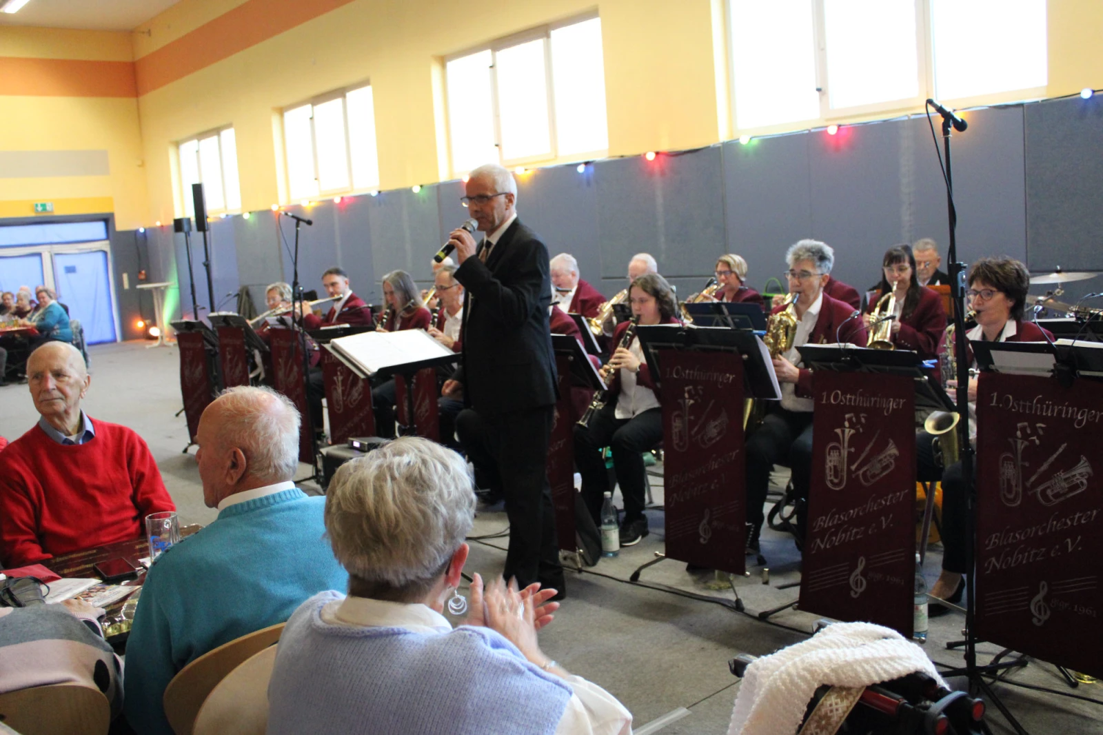 Am Sonnabend, 22.11.25, freuten sich bis zu 370 Gäste des traditionellen „Schlachtfestes mit Musik“ über Gesangs- und Instrumentaldarbietungen des 1. Ostthüringer Blasorchesters Nobitz e.V. unter Leitung von Orchesterchef, Sänger und Saxophonist Maik Gräfe. Der Original-Wildecker Herzbube Wolfgang Schwalm und Wolfgang Petry-Double Frank Thärichen bereicherten zudem stimmungsvoll den Lieder- und Melodienreigen. Zwischenzeitlich servierten ganz beschaulich Hobby-Almkellner(-innen) in Trachten Getränke – und die genüsslichen Schlachtplatten! Erika aus Grimma tönte sofort los: „Würste und Hackfleisch schmecken paradiesisch gut. Wir kommen wieder!“ Nun lädt das Nobitzer Blasorchester vorerst zum Weihnachtskonzert am 7. Dezember 2025 von 16.00 bis 17.15 Uhr in die Dorfkirche Nobitz ein.
