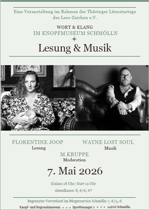 Schmölln. Am Mittwoch, dem 7. Mai 2026, lädt das Knopfmuseum Schmölln zu einem besonderen Abend zwischen Literatur und Musik ein. Unter dem Titel „Wort & Klang“ begegnen sich zwei künstlerische Welten, die auf den ersten Blick unterschiedlich erscheinen – und gerade deshalb auf eindrucksvolle Weise zusammenfinden.