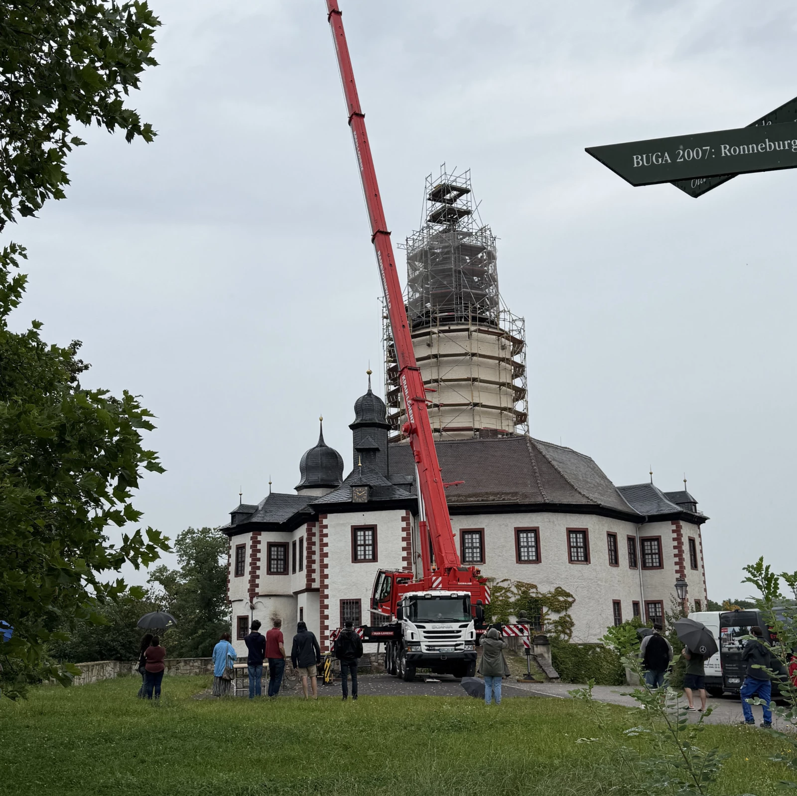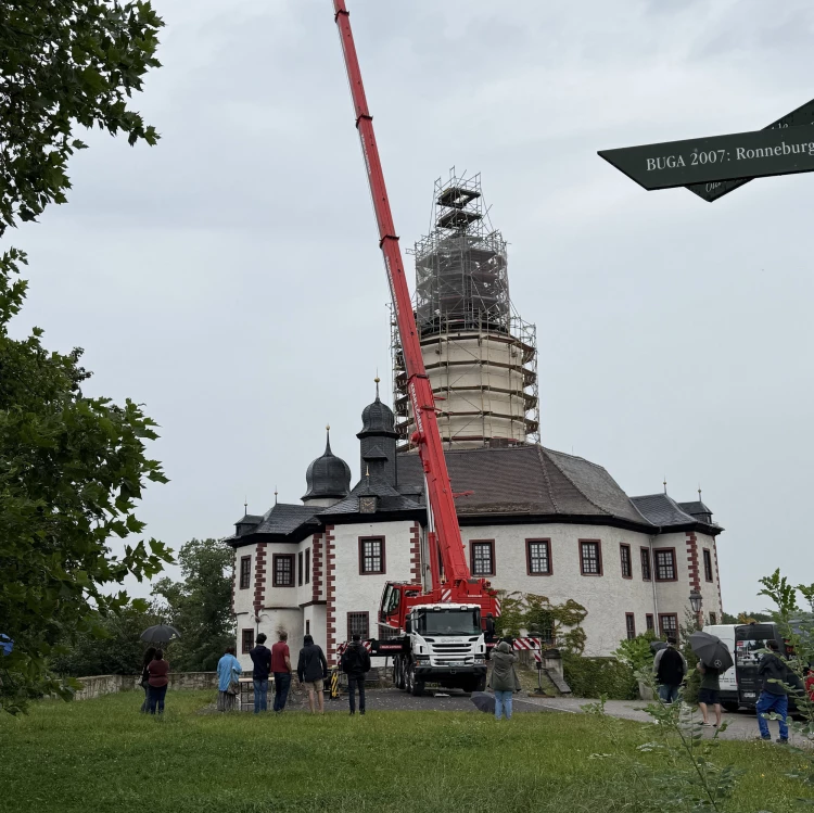 Der Bergfried der Burg Posterstein hat heute seine Kuppel samt Wetterfahne zurückerhalten. Mithilfe eines Krans wurden die beiden Turmelemente an ihren Platz gehoben. Ein besonderes Highlight war die Versiegelung einer Zeitkapsel, die in der Kuppel untergebracht wurde. Trotz des regnerischen Wetters waren zahlreiche interessierte Anwohner gekommen, um diesem bedeutenden Moment beizuwohnen.
