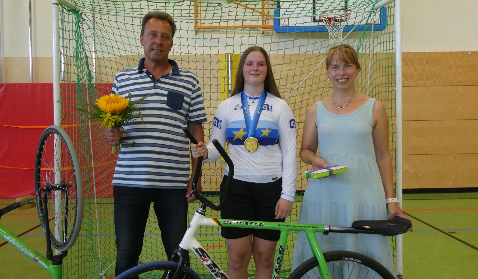 Langenleuba-Niederhain (Altenburger Land). Bei den Thüringer Radballerinnen und Radballern des SV 1949 Langenleuba-Niederhain war heute (13.08.2025) in der Schulsporthalle ein TV-Team zu Gast. Interviewt wurden U19-Europameisterin Leonie Reinicke und Trainer Marcel Taube. Auch der Radballnachwuchs des Vereins stellte sich trotz der hochsommerlichen Temperaturen mit einigen Trainingseinheiten vor. Gesendet werden wird der TV-Beitrag beim MDR in der Nachmittagssendung "Hier ab Vier". Allerdings konnte ein genauer Sendetag noch nicht bekannt gegeben werden. Dran bleiben also, es wird spannend. Radball wird eben immer populärer, dank auch der Leistungen der hiesigen Radballerinnen und Radballer aus dem Altenburger Land. Gleichwohl erfuhr bei dieser Gelegenheit U19-EM-Champion Leonie Reinicke durch den Bürgermeister der Gemeinde Langenleuba-Niederhain, Carsten Helbig, sowie vom SV 1949, Vereinschefin Silvia Kunze, eine Ehrung.