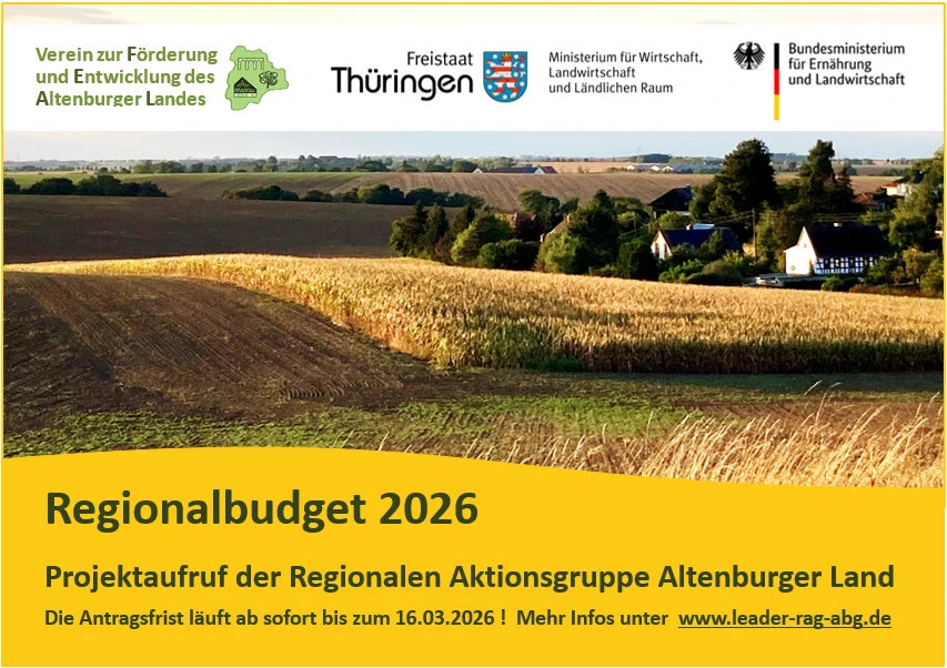 Der Verein zur Förderung und Entwicklung des Altenburger Landes (FEAL e.V.) hat sich im Rahmen des Förderprogramms "Regionalbudget" um weitere Mittel beworben, um Vorhaben zur Stärkung des ländlichen Raumes zu unterstützen. Die Förderung basiert auf dem GAK-Rahmenplan und der Richtlinie zur Förderung der integrierten ländlichen Entwicklung sowie der Revitalisierung von Brachflächen (FR ILE/REVIT). Die bereitgestellten Mittel stammen aus Bund und Land.