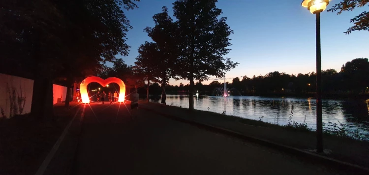 Den goldenen Pin gab es für 141 Läufer, die mindestens 10 Runden gelaufen waren, das sind stolze 16 km! Nach Sonnenuntergang erstrahlte die Laufrunde an vielen Stellen in verschiedenen Farben, das Läuferfeld hatte sich in eine schier endlose Schlange rund um den Teich verwandelt.