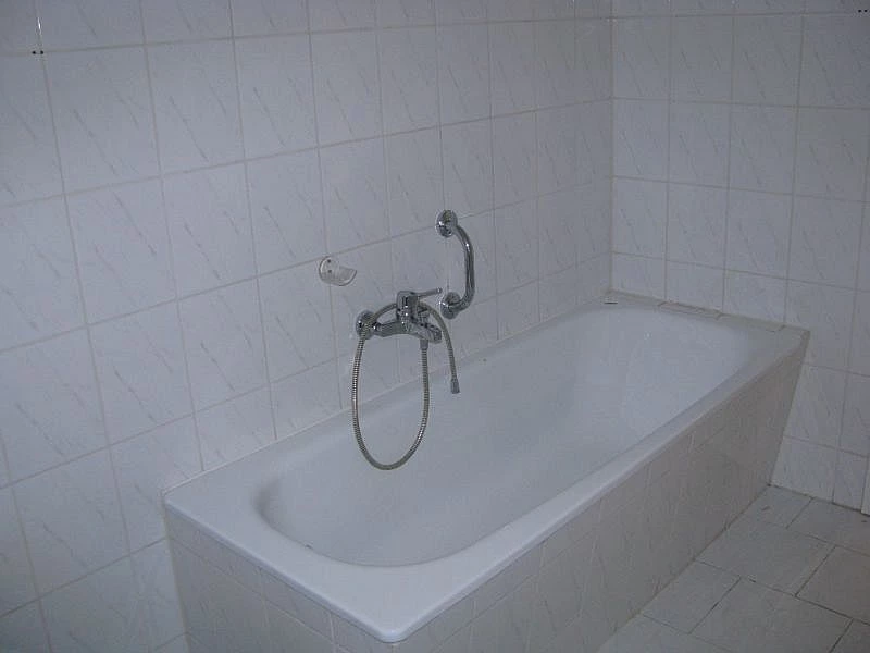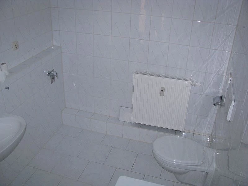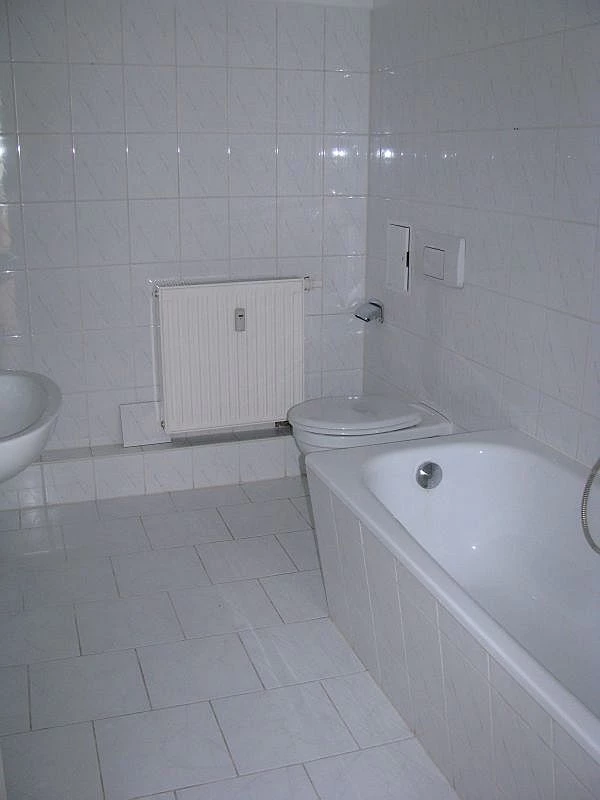 Im Flur und in der Küche ist PVC-Belag verlegt. Das innenliegende Wannenbad ist komplett gefliest. Der Anschluss für die Waschmaschine befindet sich im Badezimmer.