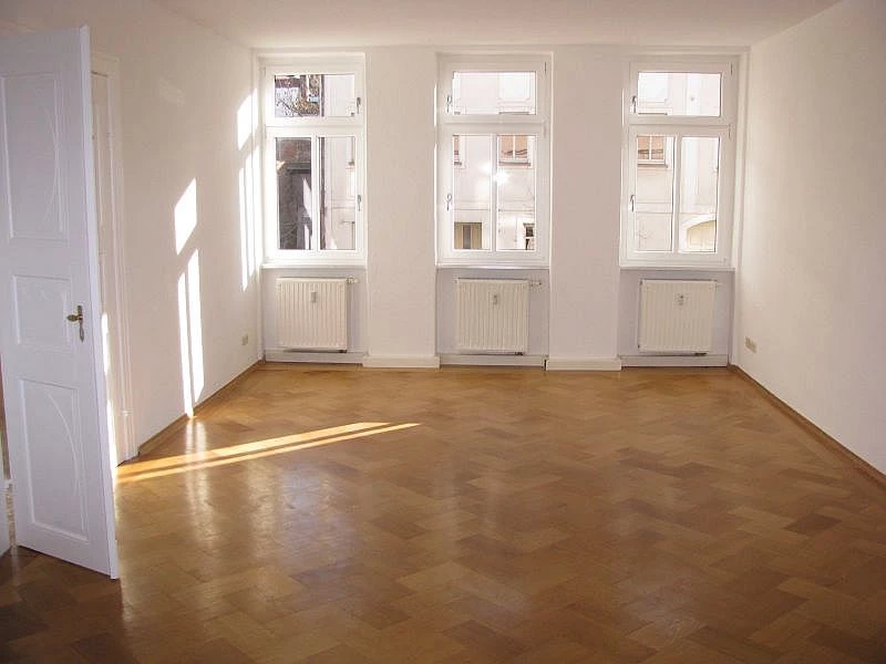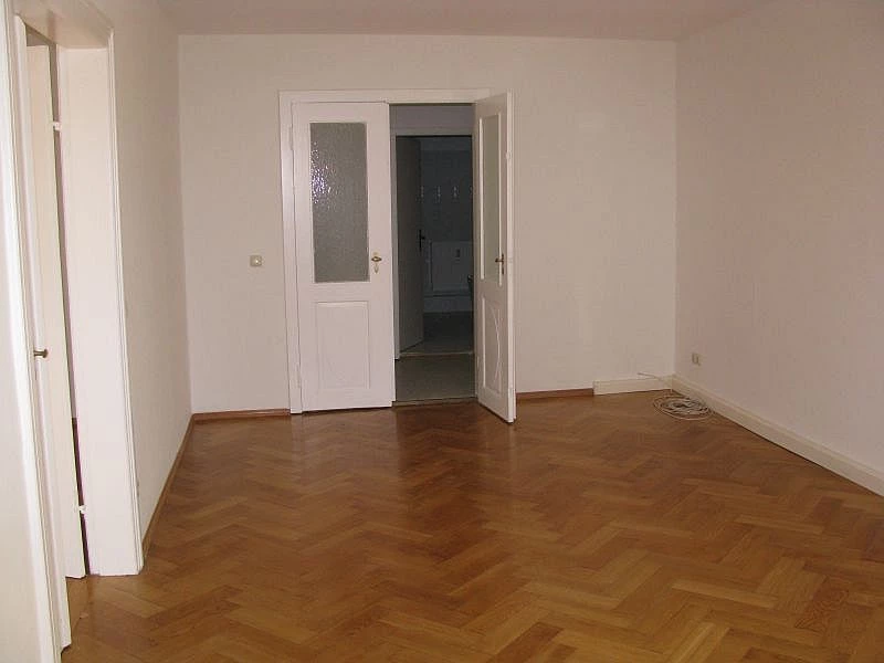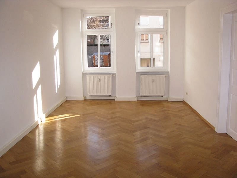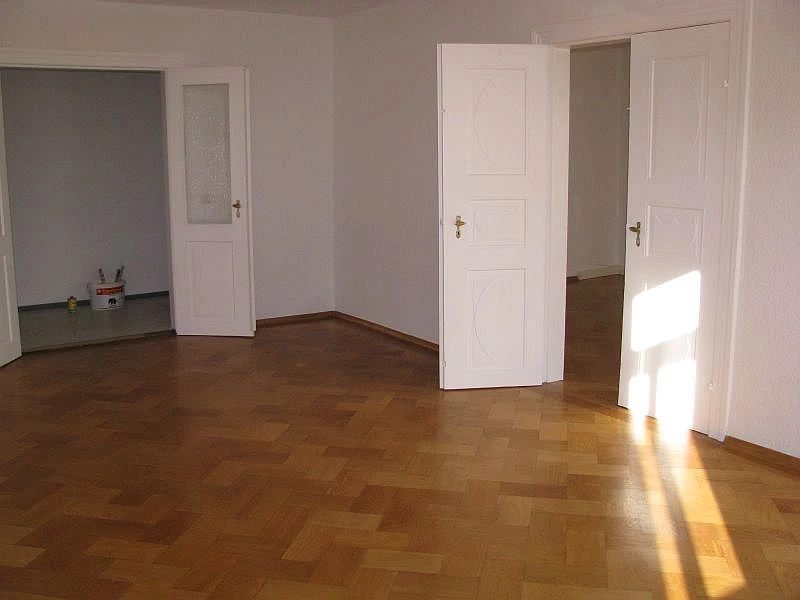 Im Wohnzimmer und im Schlafzimmer ist Parkettfußboden verlegt. Die beiden lichtdurchfluteten Räume sind durch eine breite Flügeltür getrennt.