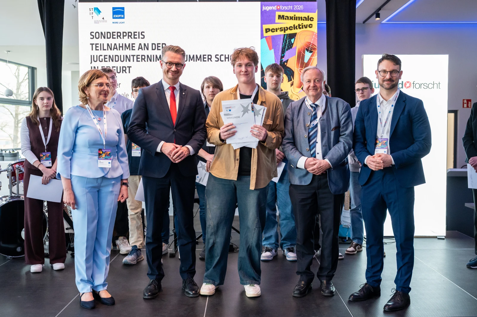 - Technik: Ben Waldmann (Ulf‑Merbold‑Gymnasium Greiz) mit dem Projekt „SORS“ (1. Platz + Sonderpreis Forschungspraktikum beim DLR am Institut Future Fuels + Sonderpreis Teilnahme an der JugendUnternimmt Summer School)
