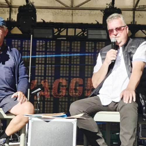 Am frühen Abend sorgten Frank Hübschmann und Hans‑Jürgen Mutz mit unterhaltsamen und spannenden Geschichten aus Schmölln für beste Stimmung und ließen lokale Geschichte lebendig werden.
