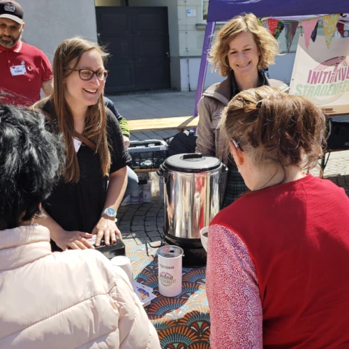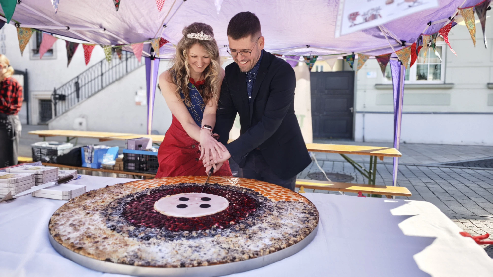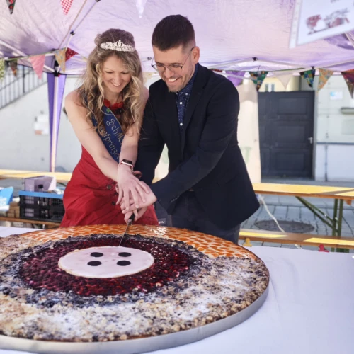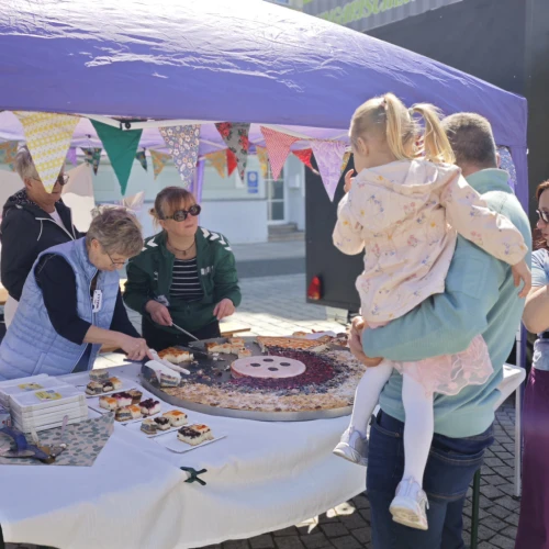Ein besonderer Höhepunkt folgte um 13:30 Uhr mit dem traditionellen Knopfkuchenanschnitt am Stand von Freiraum 22. Der Kuchen wurde erneut von der Firma Benndorf gesponsert und vom Verein verkauft. Die Einnahmen kommen einem gemeinnützigen Projekt zugute: In der Heimstätte soll ein öffentlich zugängliches Bücherregal entstehen.