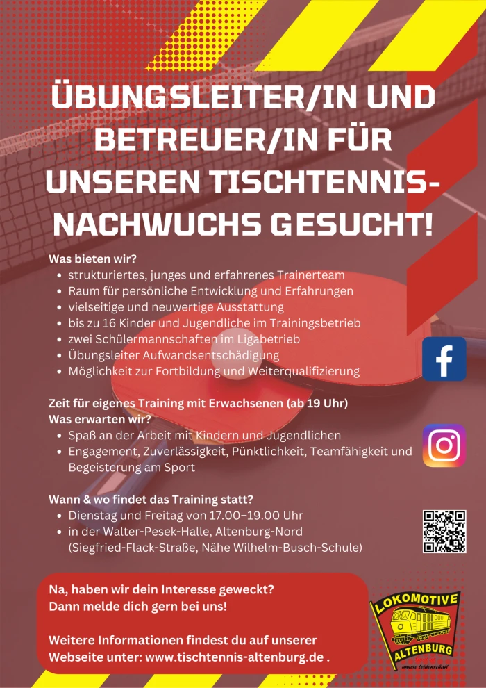 Die Abteilung Tischtennis des SV Lokomotive Altenburg e.V. sucht engagierte Übungsleiterinnen und Übungsleiter sowie Betreuerinnen und Betreuer für ihren Nachwuchsbereich. Ziel ist es, Kindern und Jugendlichen nicht nur sportliche Fähigkeiten zu vermitteln, sondern vor allem Freude an Bewegung, Teamgeist und Fairplay zu fördern.
